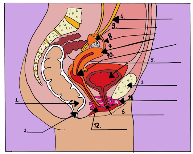 -De clitoris (nummer 11) is het orgaan dat zorgt voor seksueel genot bij de vrouw. Door de clitoris te stimuleren raakt de vrouw opgewonden. De clitoris wordt stijf en door hele kleine bloedvaatjes duwt de clitoris vocht door de vaginawand. Dit zorgt ervoor dat de vrouw ‘nat’ wordt. Dit is nodig voor penetratie.
